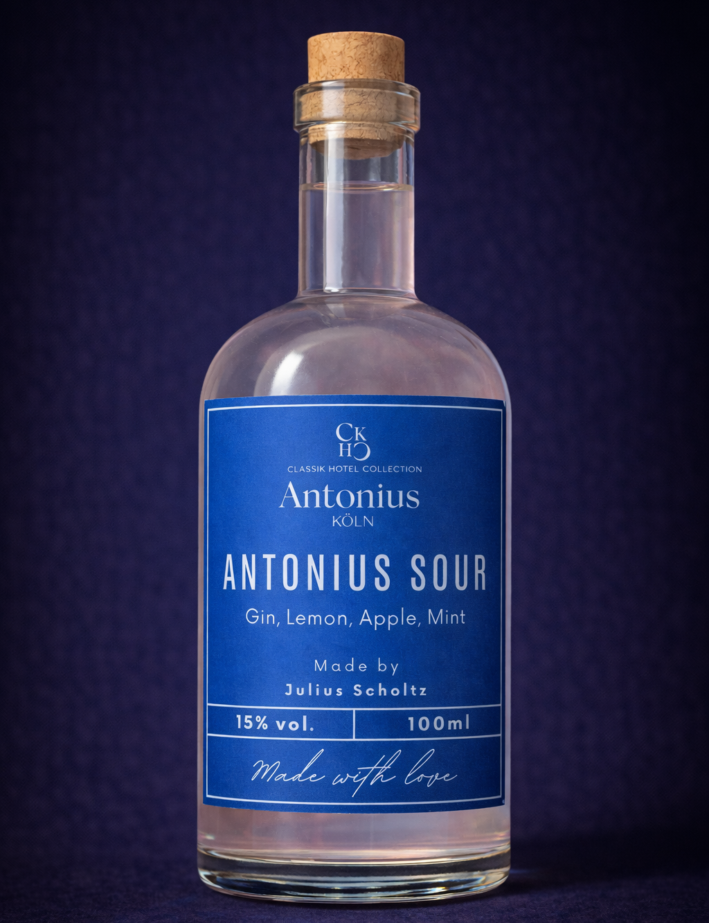 Für das Classik Antonius Hotel wollten wir etwas herstellen, das den Charakter des Hauses einfängt. Hierfür haben wir 47%igen Gin mit frischen Äpfeln und Minze infusioniert und mit Zitrone ausbalanciert. Durch natürliche Filtrationsverfahren wird der Drink haltbar gemacht und kann direkt aus der Flasche in ein Glas gegossen werden.