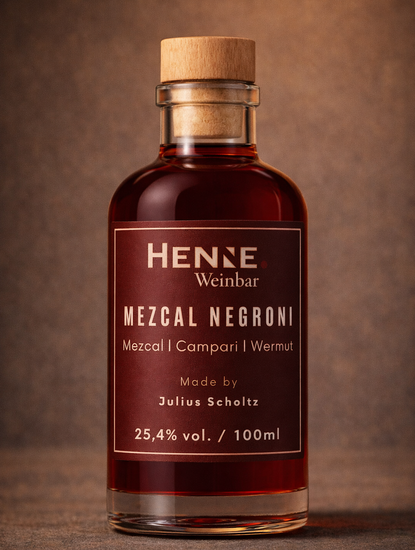 Für die HENNE Weinbar in Köln, haben wir eine exklusive Negronivariante entworfen. Eine Interpretation des Drinks mit Mezcal, den die Gäste am Tisch selber in ein Glas mit Eis füllen.